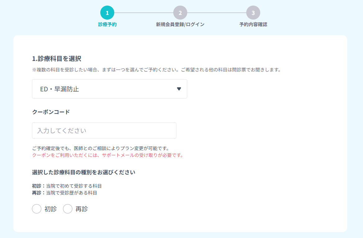 まずは診療科目で「ED・早漏防止」を選んで、初診or再診をクリックします。